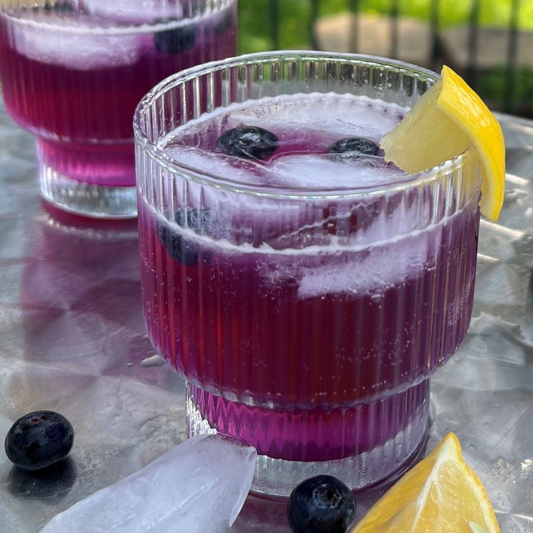 - Add ice to a tumbler followed by Indi Bleu syrup