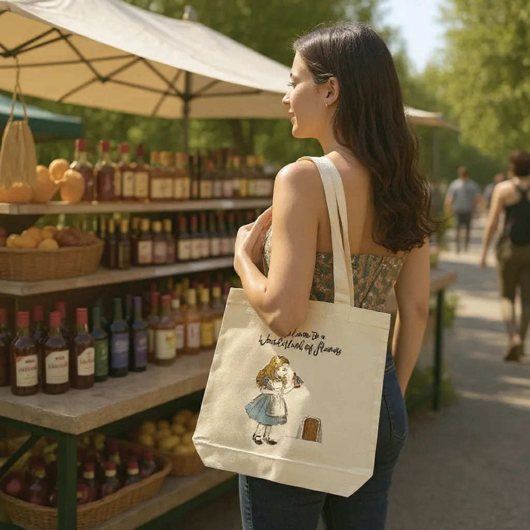 Fall down the rabbit hole into a world of curiosity, creativity and botanicals with our Alice in Wonderland–themed Botanikos Tote Bag. Designed for lovers of magic, flavour and sustainable living, this tote brings together enchanting artwork and everyday practicality.